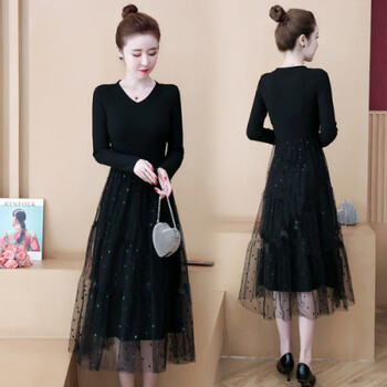 下单购买【女装新款】女装秋冬季简约针织裙子松紧腰打底拼接网纱连衣裙V领T恤 黑色【S1】 L 【95-110斤】