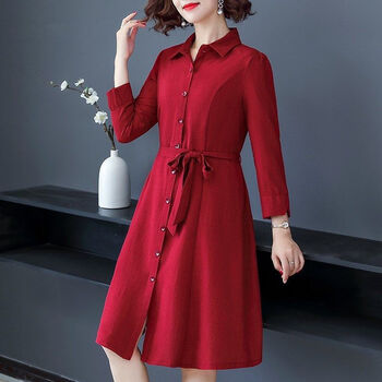 197.51元抢购【女装新款】妈妈秋装连衣裙2021中年新款阔太太洋气高贵衬衫中老年女春秋裙子 红色 3XL 【建议125-140斤】
