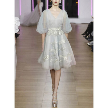 女巫和骑士旗舰店 有售 评价原创设计师女装女巫和骑士超仙高级灰泡泡袖绣花连衣裙2021年初秋裙子 浅灰 M