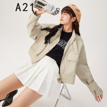 A21官方旗舰店 有售 A21秋冬季2021女装新款宽松立领长袖短装开胸夹层夹克外套 杏色 S